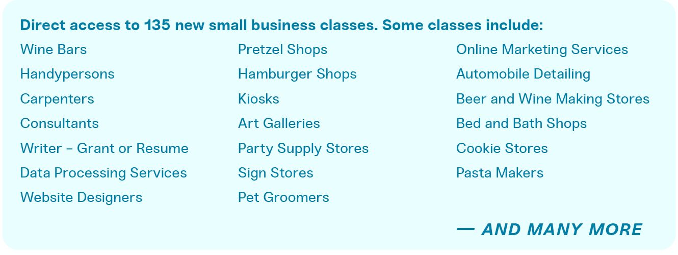 With our new classes, you and your clients get access to over 30 new coverages and endorsements bundled into one policy. Some coverages include Additional Insured by Contract, Agreement, or Permit, Hartford Steam Boiler Cyber Suite, and many more.